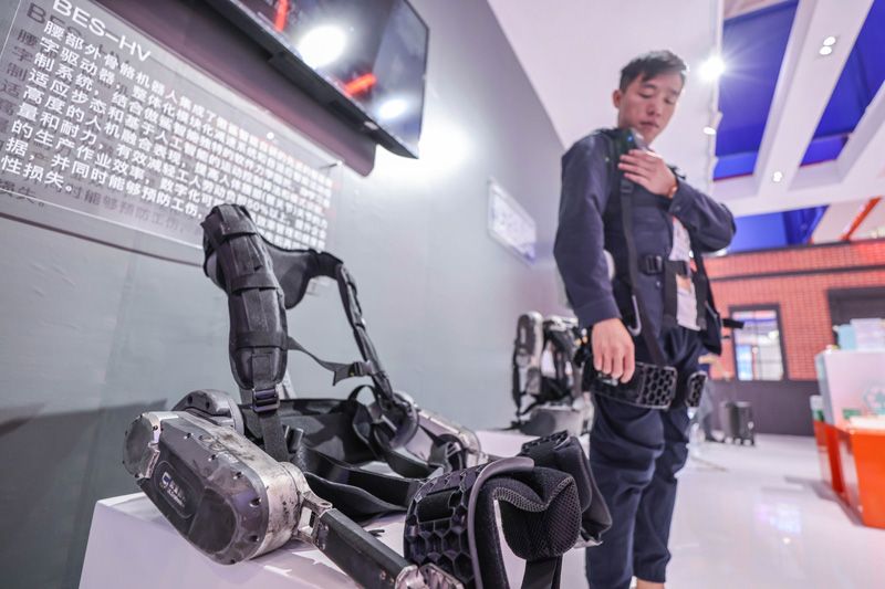 4月13日,参展商在上海展台展示腰部外骨骼机器人。(图片来源:新华社)