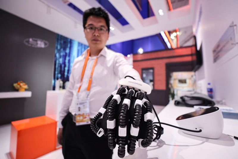 4月11日,参展商在上海展台展示手功能训练机器人。(图片来源:新华社)