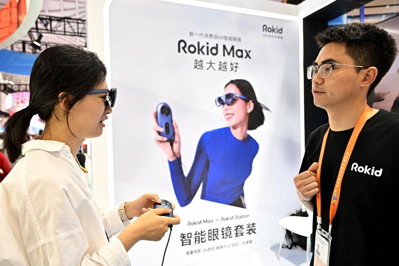 4月13日,一名参观者在浙江展台体验一款智能眼镜。(图片来源:新华社)