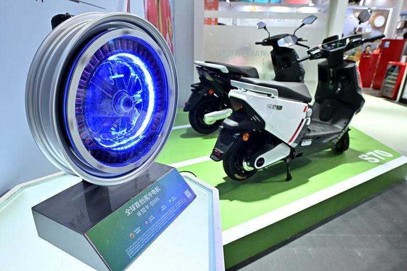 这是浙江展台展示的绿源电动车液冷机芯,它可以提高电机效率、增加电动车续航(4月13日摄)。(图片来源:新华社)