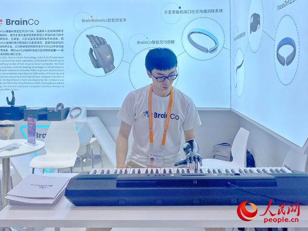古月戴着智能仿生手在消博会现场演奏乐曲。(图片来源:人民网)