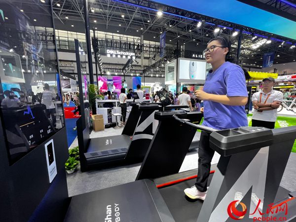 观众在消博会现场体验3D智能专业跑步机。(图片来源:人民网)