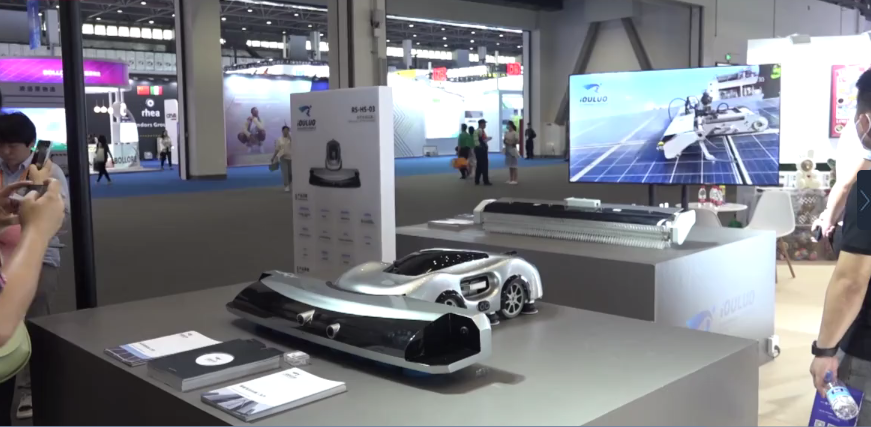一款幕墙清洗机器人亮相第三届中国国际消费品博览会。该产品名为吸盘纯平机器人,可对摩天大厦的玻璃幕墙进行清洁,其吸附性强、安全性强,在6级风情况下仍可工作。(图片来源:中新视频)