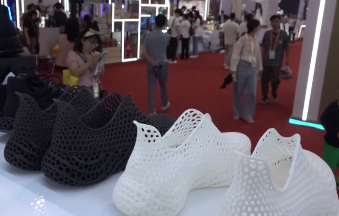 售价1298元人民币的3D打印鞋亮相第三届中国国际消费品博览会。据介绍,在设计师的数字化设计与3D打印智能制造的结合下,该产品因其造型独特,设计师将其命名为“细胞鞋”,其特点轻盈、软弹、回弹性好。(图片来源:中新视频)