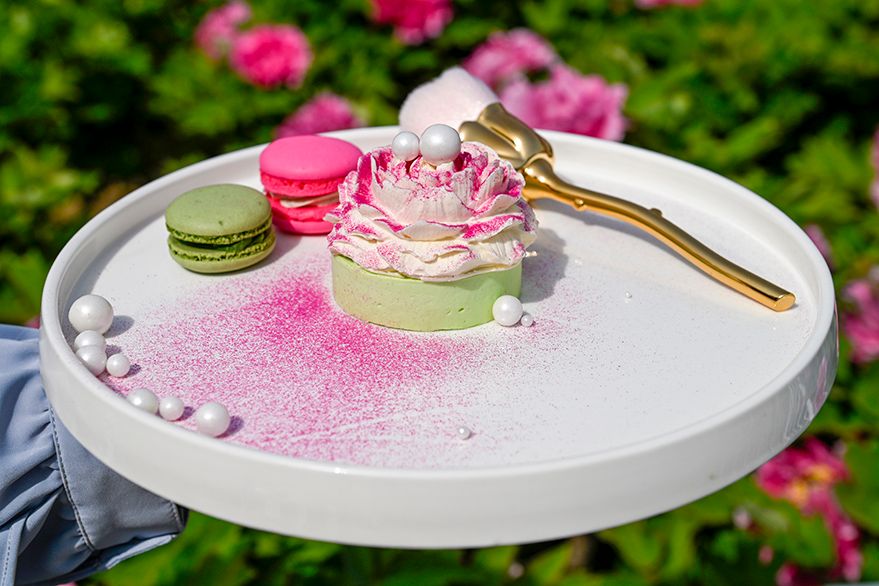 4月19日,工作人员展示圆明园推出的以牡丹花为主题的甜品。(图片来源:中国日报网)