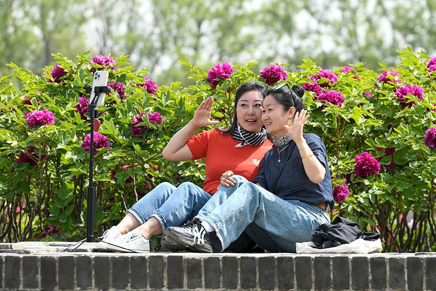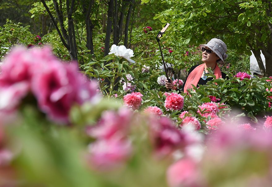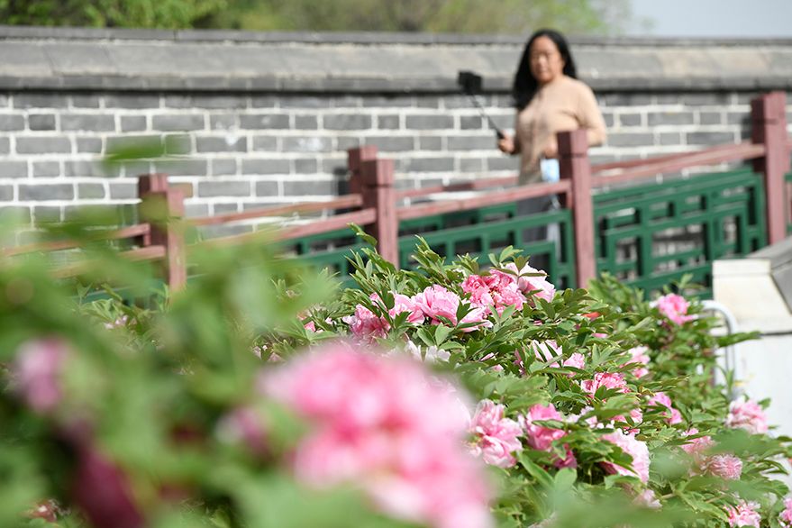 4月19日,游客在北京圆明园内的牡丹花前自拍。(图片来源:中国日报网)