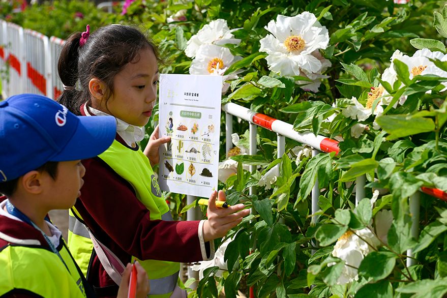 小朋友在含经堂的牡丹花观赏区参观游学。(图片来源:中新社)