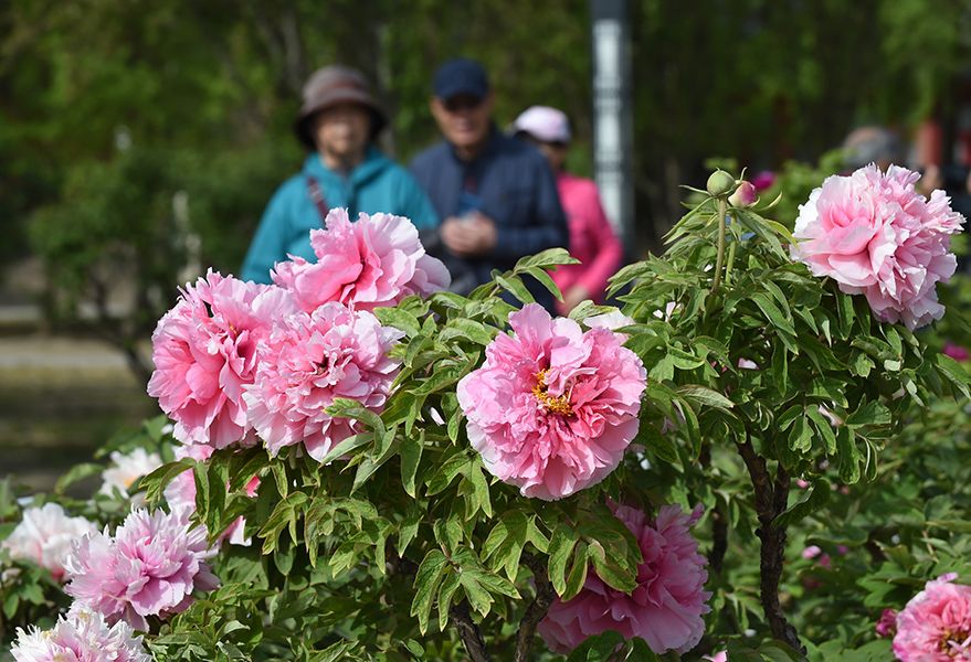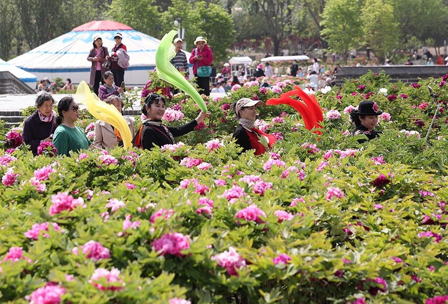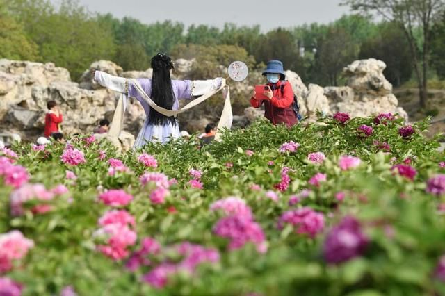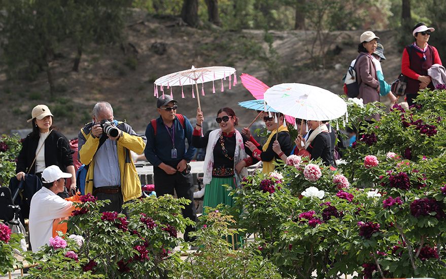 游客在含经堂的牡丹花观赏区游玩赏花。(图片来源:中新社)