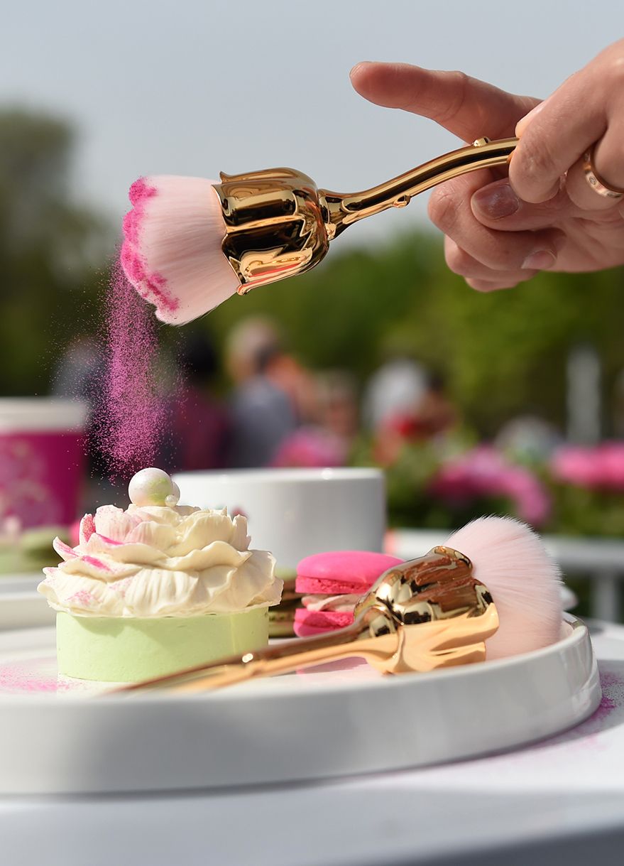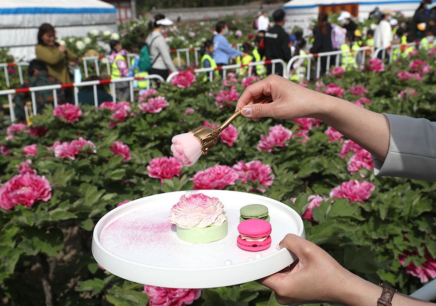 4月19日,工作人员展示圆明园推出的以牡丹花为主题的甜品,游客可以自己动手,将粉红色的果粉撒在牡丹花造型的甜品上。(图片来源:新华社)