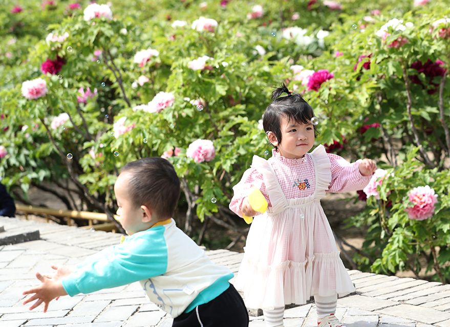 4月19日,小朋友在北京圆明园盛开的牡丹花旁玩耍。(图片来源:中国日报网)