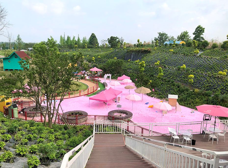 4月20日拍摄的温江区鲁家滩湿地公园中的“网红”粉色沙滩。