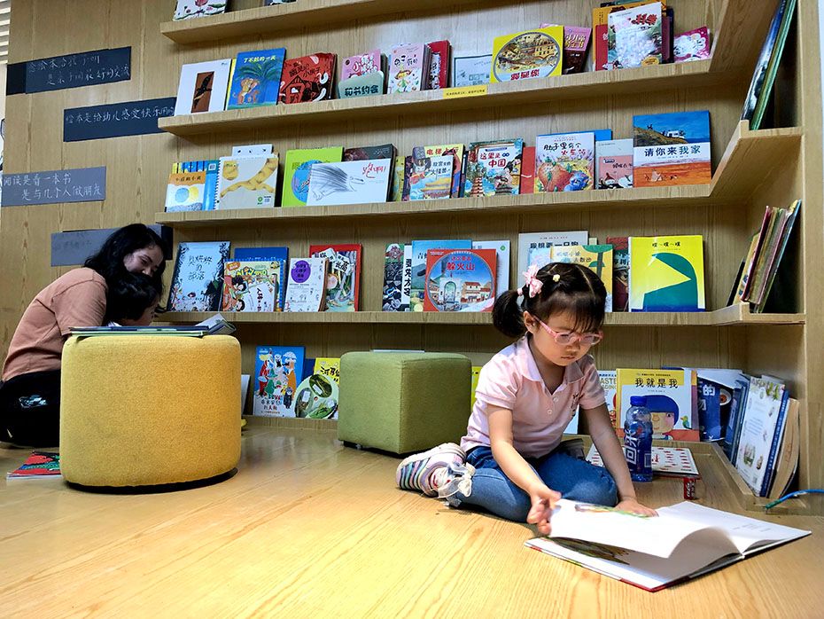 在一家以少儿绘本为主题的留灯书屋中,儿童正在认真阅读。