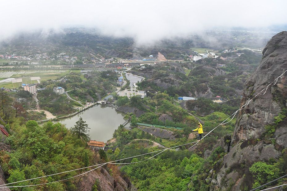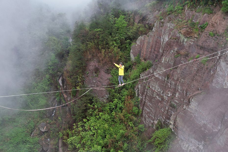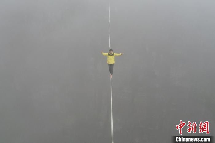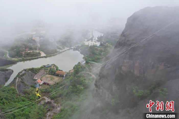 【欧洲时报网】4月24日,第二届平江天岳石牛寨高空扁带节在湖南平江开启。扁带达人在大雾中挑战跨度300多米的崖壁之间进行高空走扁带,犹如云端漫步。