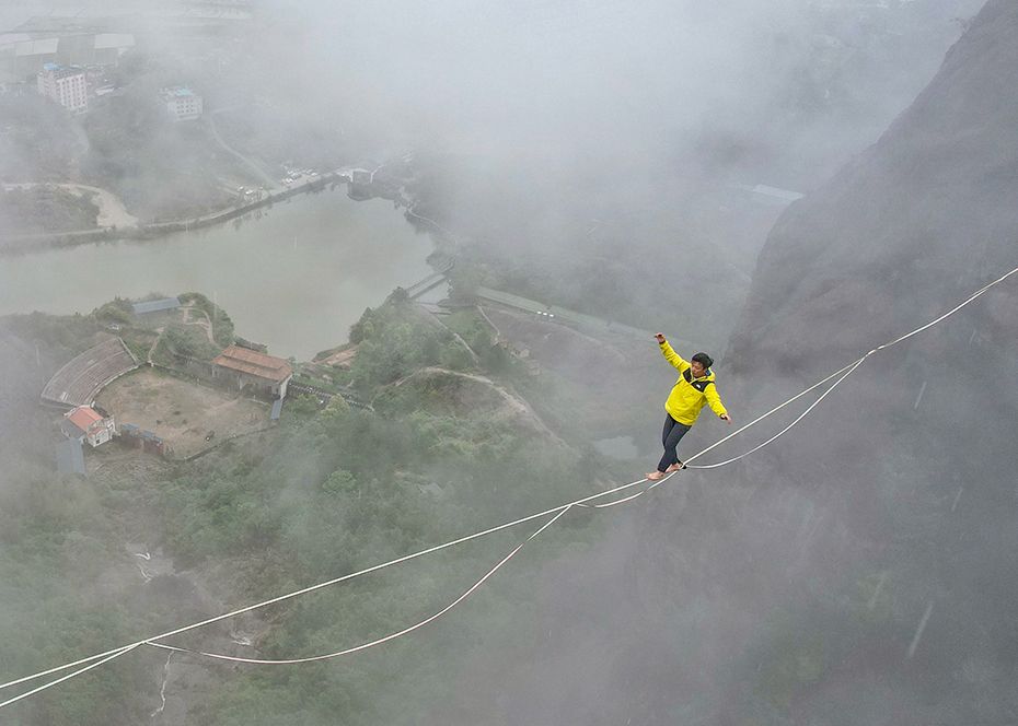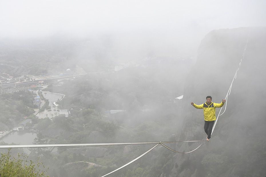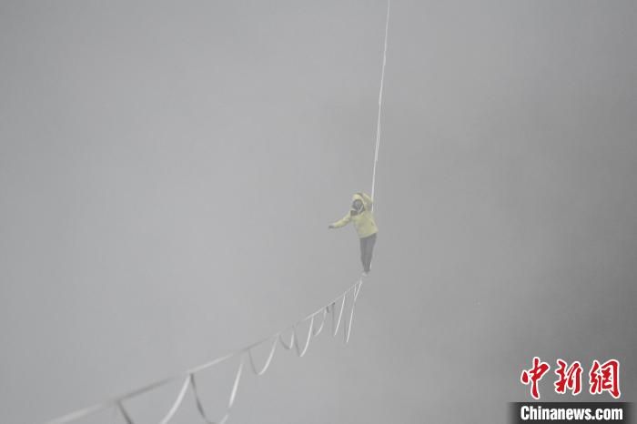 扁带达人在大雾中保持平衡。(图片来源:中新网)