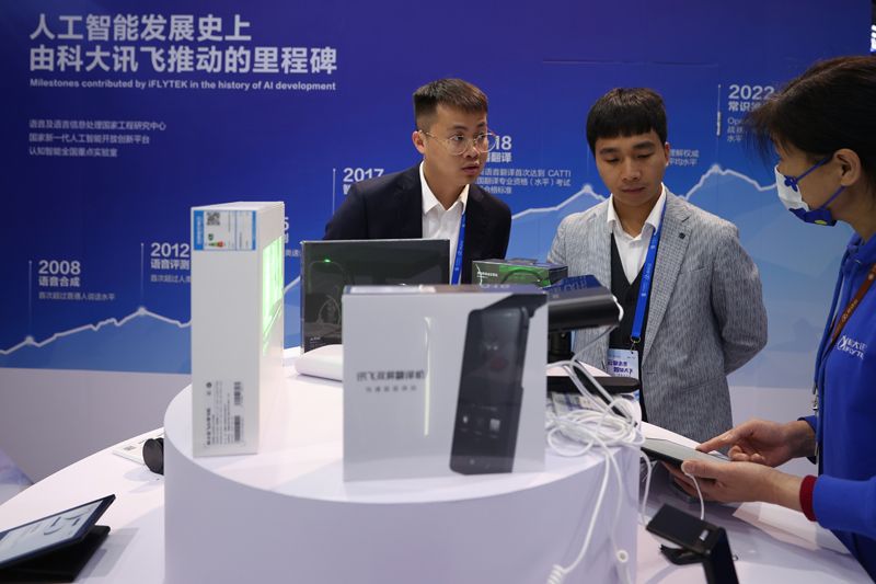 在大会展厅,科大讯飞的翻译产品吸引客商。(图片来源:中新社)