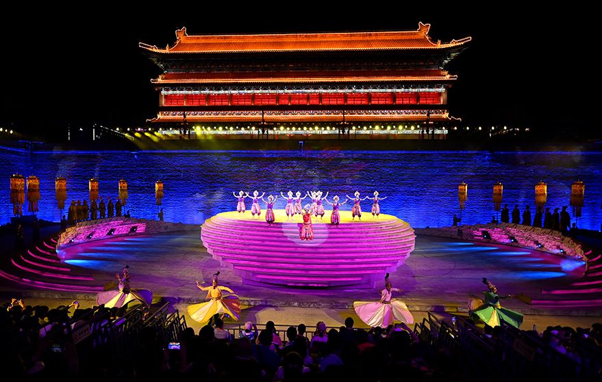 4月30日,游客在西安城墙景区观看《梦长安——大唐迎宾盛礼》。