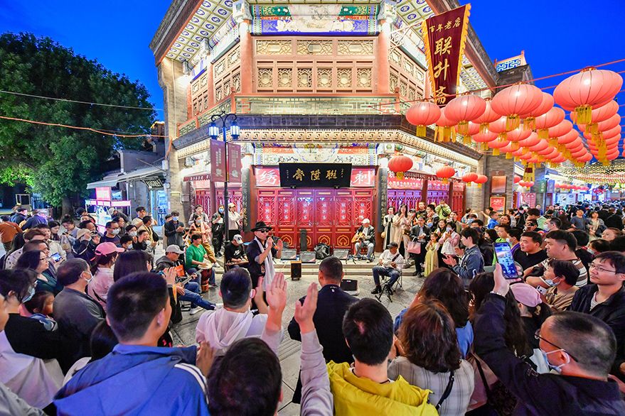 4月29日,游客在天津古文化街欣赏歌手演唱。“五一”假期期间,作为“津门十景”之一的天津古文化街开启了“夜游”模式,繁荣夜间文旅消费。全街百余户商家延时经营,助力城市“夜经济”活力提升。