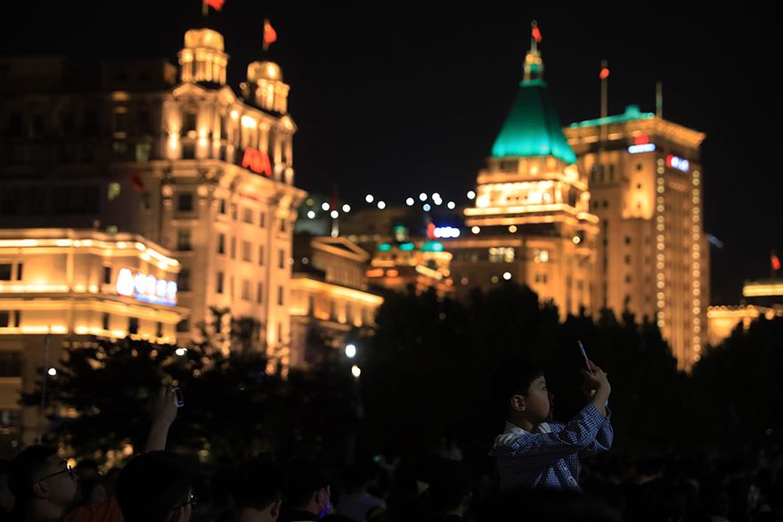 4月30日晚,游客在上海外滩欣赏黄浦江两岸绚丽多姿的夜景。(图片来源:中新社)