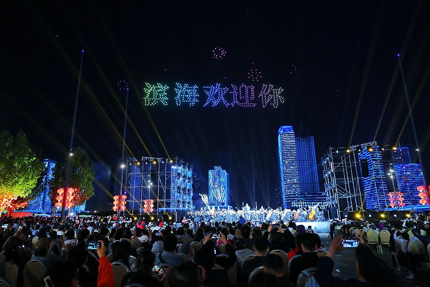 4月30日晚,在天津滨城于家堡滨河公园举办的“向海乐活节”上,百人交响音乐会伴随着无人机高空灯光秀表演,吸引了许多市民及游客前来观赏。(图片来源:中新社)