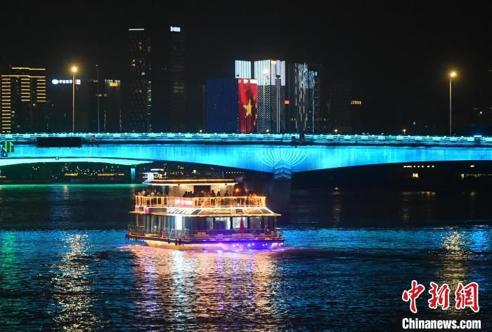 4月30日晚,游客乘坐游船夜游闽江赏两岸风光。“五一”假期,福州新开多条闽江夜游航线,同时还在多个码头开展民俗演艺活动和文创集市活动,吸引许多市民游客前去参观体验。(图片来源:中新网)