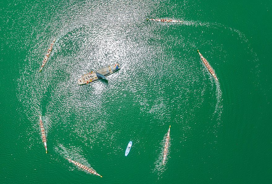 5月1日,湖北省宜昌市秭归县归州镇万古寺村村民与游客共同划龙舟(无人机照片)。(图片来源:本文图片除标注外均自新华社)