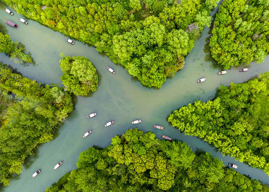 5月2日,游客在江苏省泰州市姜堰区溱湖国家湿地公园内乘坐摇橹船游玩(无人机照片)。