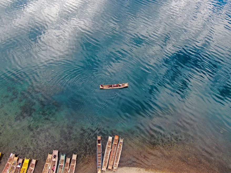 5月2日,游客在云南省丽江市宁蒗彝族自治县境内的泸沽湖乘船游览(无人机照片)。