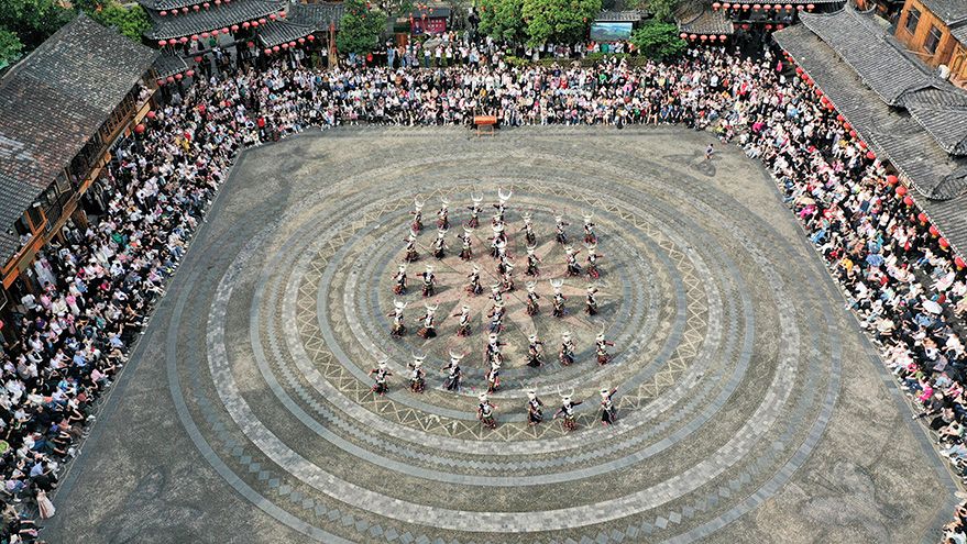 5月2日,游客在贵州省黔东南苗族侗族自治州雷山县西江千户苗寨观看民族歌舞表演(无人机照片)。
