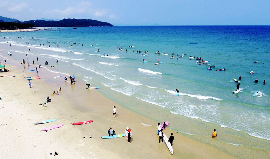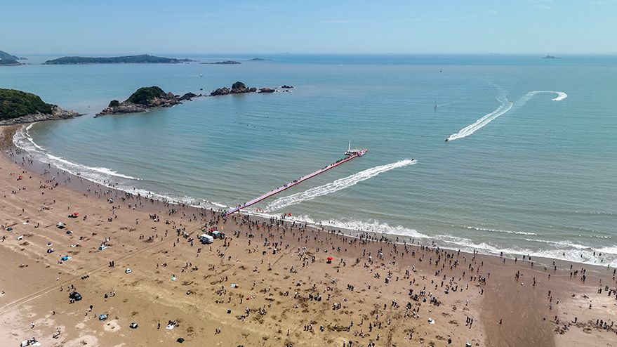 5月2日,游客在浙江省舟山市朱家尖大青山里沙景区游玩(无人机照片)。