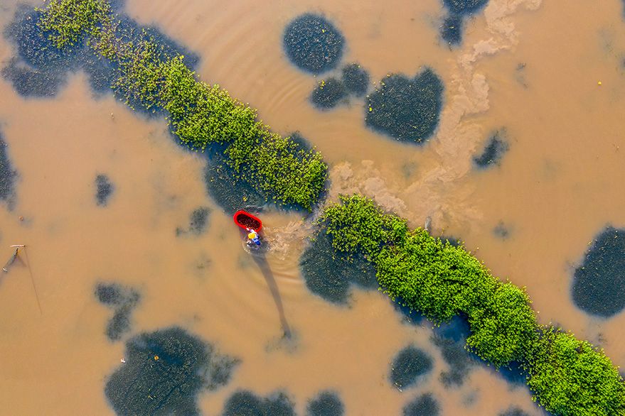 5月1日清晨,在江西省樟树市黄土岗镇窑下村稻虾轮作种养基地,养殖户起网收获小龙虾,供应节日市场(无人机照片)。