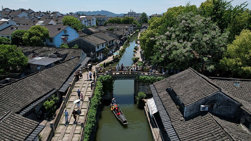 5月2日,浙江绍兴八字桥一景。作为中国首批24个历史文化名城,拥有2500多年建城史的绍兴是著名的水乡、桥乡。“五一”期间,来自各地的游客漫步古桥、乘坐乌篷船,享受悠闲的假日时光。(图片来源:中新社)