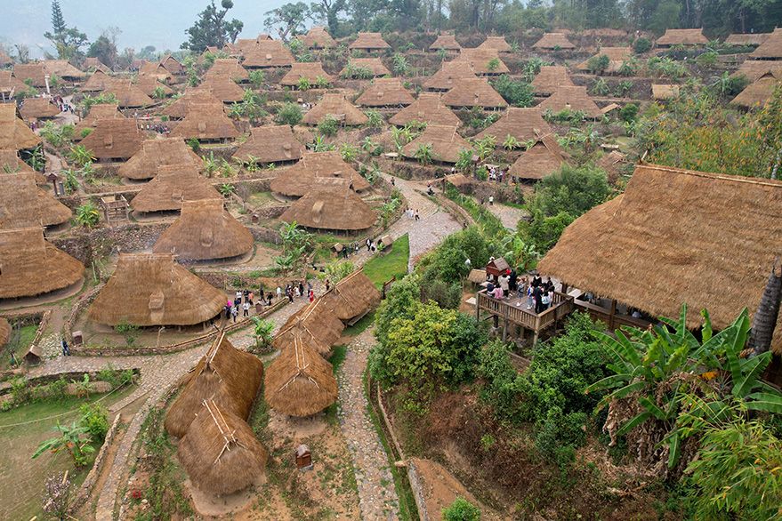 5月1日,游客在翁丁村内游览。正值“五一”假期,云南省临沧市沧源佤族自治县翁丁村吸引游客前来感受佤族风情。(图片来源:中新社)