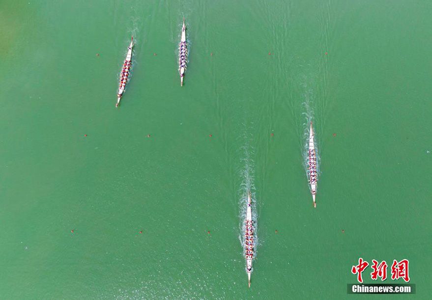 5月1日,河南省第十届“中华轩辕龙舟大赛”暨中国(漯河)美食嘉年华之2023年漯河市龙舟公开赛在沙澧河交汇处开幕,图为龙舟大赛比赛现场(无人机照片)。(图片来源:中新网)
