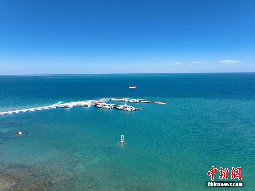 素有“高原蓝宝石”之称的青海湖天高云淡、波光粼粼。远处的山与碧蓝的湖水交相辉映,宛如油画,美不胜收。(图片来源:中新网)