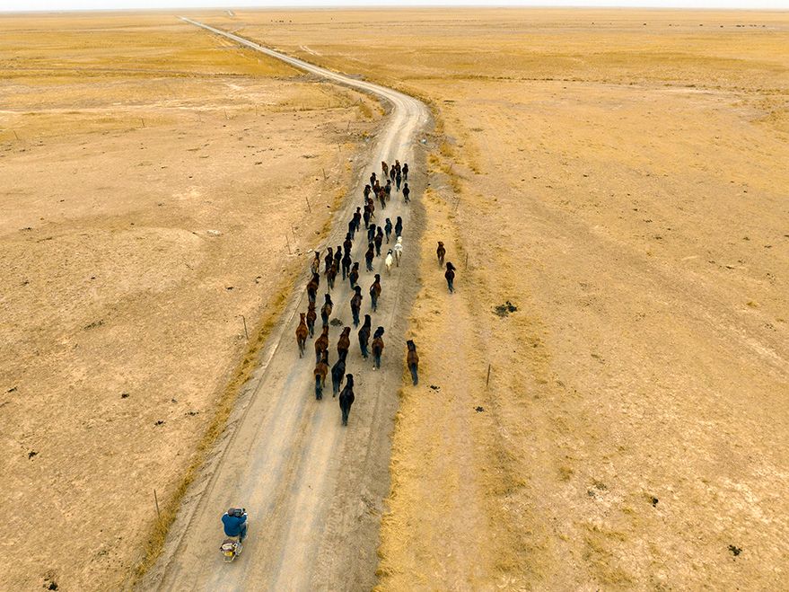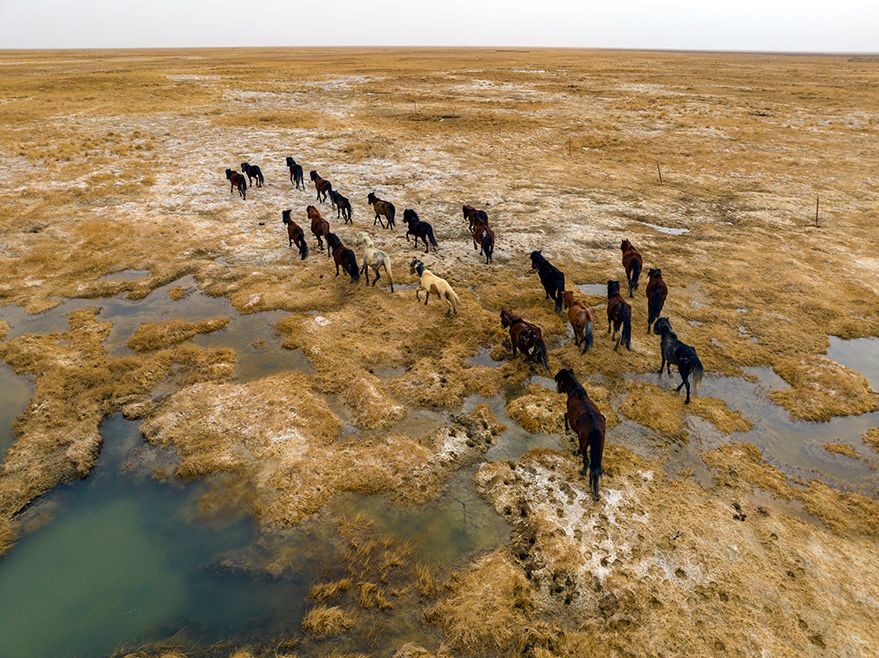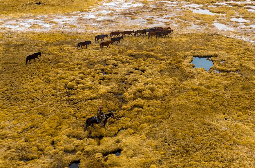 5月3日,在阿克塞县阿伊纳乡海子草原,牧民赶着马群进行转场(无人机照片)。