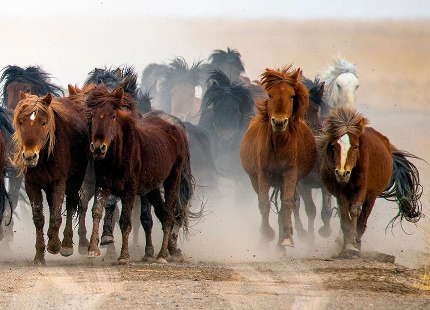 5月3日,在阿克塞县阿伊纳乡海子草原,马群转场去往夏季牧场。
