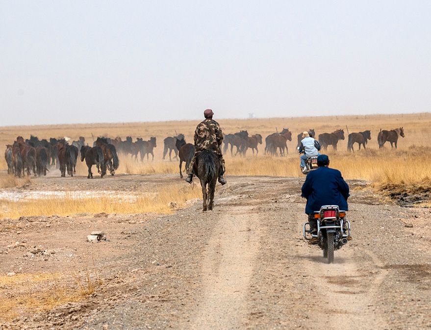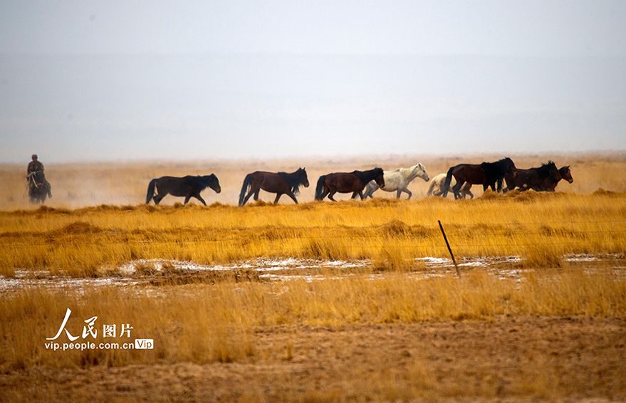 5月3日,在阿克塞县阿伊纳乡海子草原,牧民赶着马群进行转场。(图片来源:人民网)