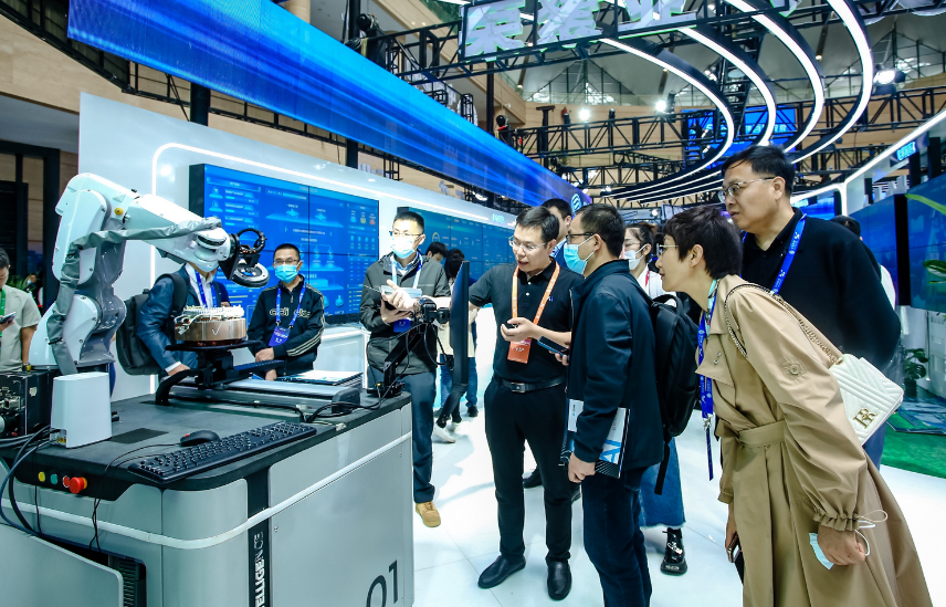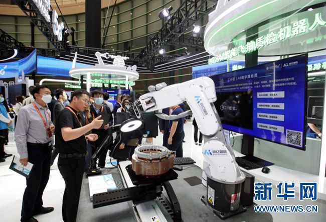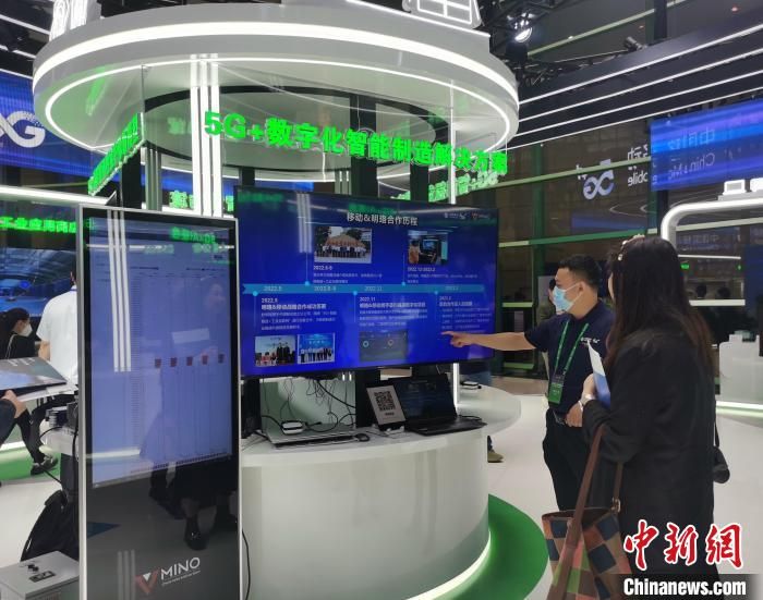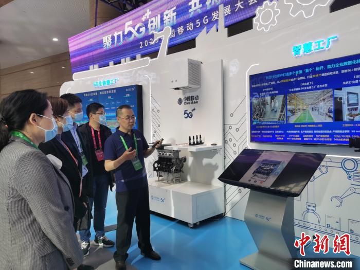 依托5G、人工智能、边缘计算等新一代信息技术,中国移动联合行业客户、合作伙伴在矿山、纺织、装备、采矿、电力、钢铁等领域打造多个行业标杆,让传统工业焕发出数字新生机。图为工作人员讲解“5G智慧工厂”。(图片来源:中新网)