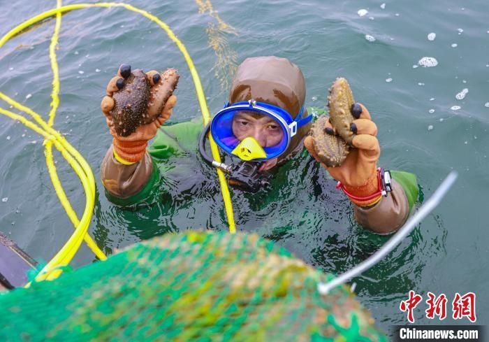 在山东省荣成市虎山镇天海湾海洋牧场海参养殖海区,“海猛子”在捕捞海参。(图片来源:中新网)