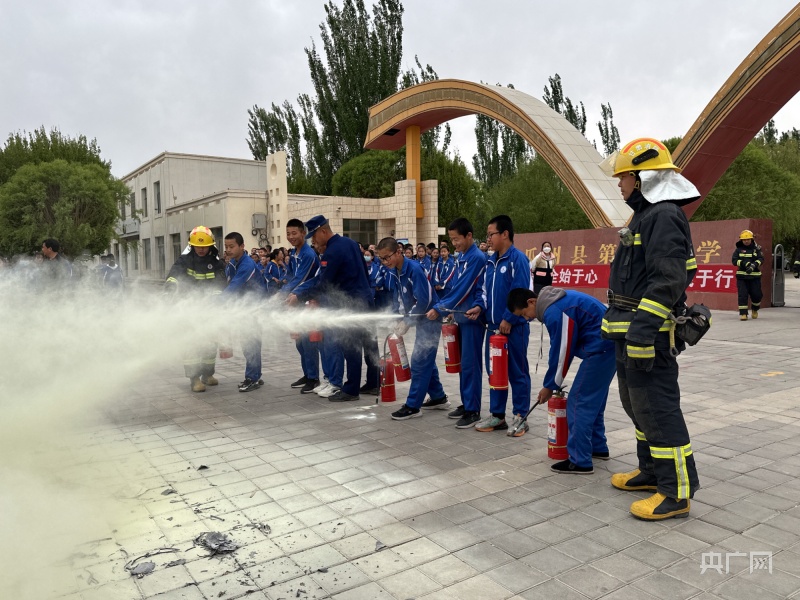 甘肃瓜州县第三中学开展“5.12”防灾减灾主题消防安全培训进校园活动,图为同学们现场学习干粉灭火器的使用方法。(图片来源:央广网)