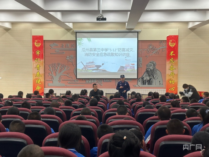 近日,甘肃酒泉瓜州消防救援大队联合瓜州县教育局、应急管理局前往瓜州县第三中学开展“5.12”防灾减灾主题消防安全培训进校园活动,并指导师生进行应急逃生疏散演练。图为消防安全培训讲座。(图片来源:央广网)