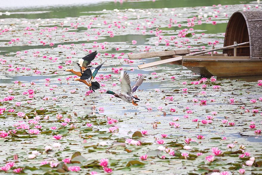 5月10日,江苏南京紫金山燕雀湖,湖面盛开的睡莲与鸟禽构成一幅和谐的生态画卷。(图片来源:中新社)