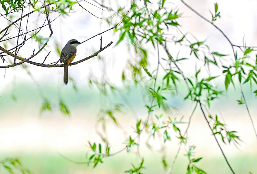 立夏时节,平均海拔3645米的西藏拉萨市拉鲁湿地国家级自然保护区里,草绿水清鸟儿欢,景色诱人。拉鲁湿地树枝上一只四处观望的灰背伯劳(5月6日摄)。(图片来源:新华社)