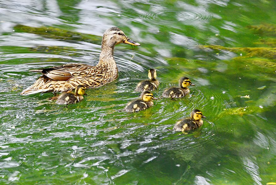 一只母绿头鸭带着小鸭在拉鲁湿地畅游觅食(5月6日摄)。立夏时节,平均海拔3645米的西藏拉萨市拉鲁湿地国家级自然保护区里,草绿水清鸟儿欢,景色诱人。(图片来源:新华社)