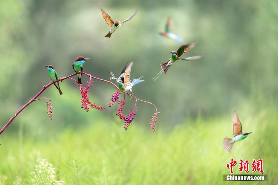 初夏时节,在河南省信阳市新县,良好的生态环境吸引了白鹭、冠鱼狗、蓝喉蜂虎等众多鸟类在此“安营扎寨”,打造出一幅“鸟类天堂”的美景画面。图为蓝喉蜂虎。(图片来源:中新网)