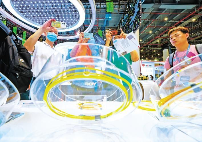 观众在长飞光纤展台拍摄不同规格与用途的光纤产品。(图片来源:《湖北日报》)