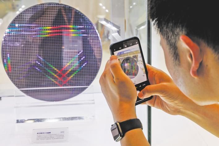 5月16日上午,一名嘉宾在展台前拍摄芯片晶圆。(图片来源:《湖北日报》)