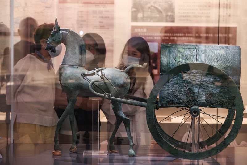 5月18日,“万桥飞架——贵州桥文化展”在位于贵州省贵阳市的贵州省博物馆开展。展览分为五个部分,以时间为展示主线,以桥为展示核心,对贵州桥梁史、道路交通史以及一座座高桥进行展示和诠释。图为贵州省博物馆镇馆之宝——东汉铜车马吸引参观者。(图片来源:中新社)