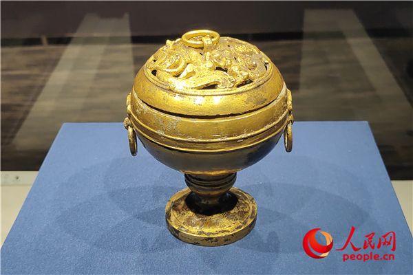 5月18日,众多见证着文明交流互鉴的精美文物齐聚福建博物院“福航天下——海上丝绸之路的文化印记”展览,在展厅中静静地等候着与观众相见。图为展出的鎏金铜熏炉。(图片来源:人民网)