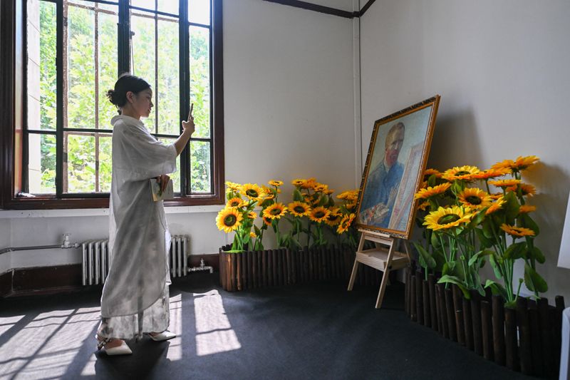 天津数字艺术博物馆于18日正式向公众开放。图为5月16日,观众在天津数字艺术博物馆“梵高的世界”全景数字艺术互动大展预展上通过手机扫描展品观看AR动画。(图片来源:新华社)